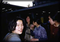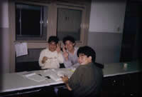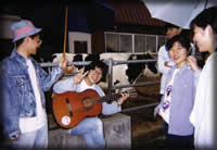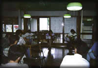大学に隣接したところに“青年の家”なるものがあるのだがギタ研 は春と秋で年2回合宿を行う(夏合宿とは別物)。中でも秋の合宿は 定演の直前くらいに行われ、リハーサルの意味合いを持つ重要な行 事である。寝食はここで、昼は学校、夜はギターと結構ハードであ る。TKDは配達に起きられないとの理由で一人家に帰ってたのだが協 調性のない奴だ、と今にして思う。写真は部長、全体指揮者、学年 指揮者のトップ達で夜遅くまで打ち合わせをしている様子。