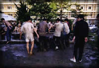 TKDが3年時の後夜祭は最悪!酔いつぶれるヒト続出で、救急車で2人搬送、両腕・両足抱えられて の帰宅1人、なんかしらんが泣き出す者後を絶たずとわけわからんかった。最近はどうなのだろう ? 写真は92年5月28日(木)〜31日(日)学祭前夜祭での池落としの様子。
