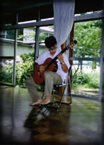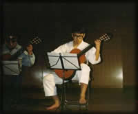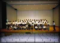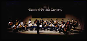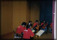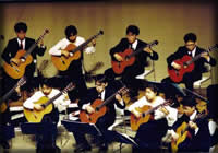 上の画像をクリックすると第19回定演の全体合奏曲が始 まるよ。K合さんの名指揮がしのばれる。 1年のサークル活動の総決算。例年、“教育文化会館”か“市民プラ ザアンサンブルホール”の1500人くらい入るホールを借り切って3時 間ほどギターのみの演奏会を行う。300〜500円を入場料として徴収 するので、この日ばかりはみんなマジ!