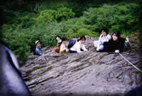 予備知識があまりなく何とかなるだろうくらいの気持ちで行ったのだが 、とんでもない急な崖だらけで、ギブアップする者が出ると思った。が 、一人も落伍者が出なくツアーが成功裏に終わったので主催者としては うれしい限りだった。左はロープを伝わらないといけないような一枚岩 の急斜面を登る皆さん。右は、左手が数十メートルの断崖絶壁。皆恐る 恐る下を覗いている。